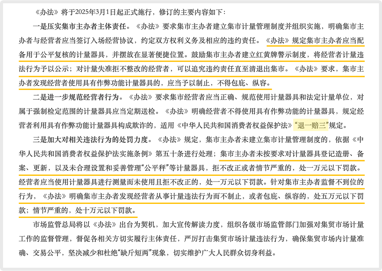 ○ 2025年3月1日:新版《集貿(mào)市場計量監(jiān)督管理辦法》施行。其中核心變化之一是全面壓實了市場主辦方的管理主體責任。要求其建立計量管理制度、對場內(nèi)秤具登記備案,并有責任制止并不得包庇計量作弊行為,否則將面臨高額罰款。這些規(guī)定從市場管理源頭建立了防線,促使市場主動加強對合規(guī)電子計價秤的監(jiān)督與采用。
